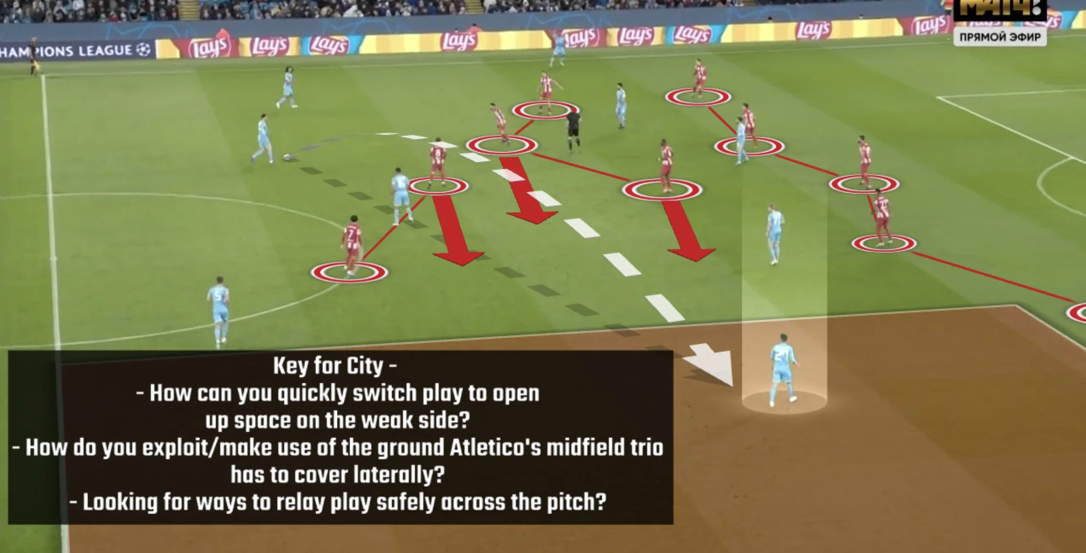 В першому таймі Манчестер Сіті не вистачало діагоналей з флангу на фланг та індивідуальний просувань з центру у штрафний. Підопічні Гвардіоли виглядали занадто статично, однак Атлетіко ризикував зі своїм вкрай компактним блоком.