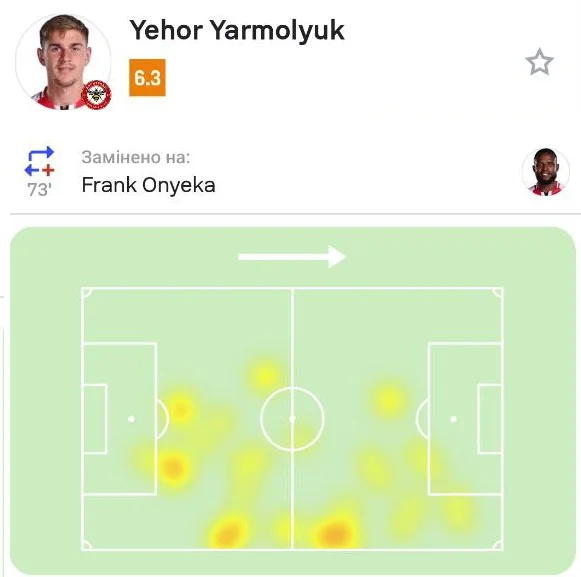 У атаці теж все було непогано в позиційному аспекті. Його переміщення підтримували високий темп "бджіл", однак не вистачало прямого імпакту. Два лонгболи й один крос від Ярмолюка до адресата не дійшли, а інших пасів на загострення Єгор не виконав. Можливо, він би зробив вирішальний внесок наприкінці зустрічі, однак українця замінили на 73-й хвилині.