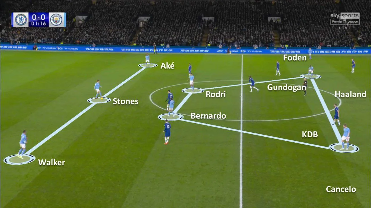 От і в матчі 19-го туру АПЛ проти того ж Челсі коуч перемудрив. Ман Сіті приїхав у Лондон із новою ігровою моделлю. При роботі без м'яча опорник Родрі опускався до центру оборони, де формувалася четвірка. Коли ж у команди був м'яч, він залишався в опорній зоні поруч з Бернарду Сілвою, а Канселу з Фоденом давали ширину на флангах – при цьому Жоау не зміщувався у центр.