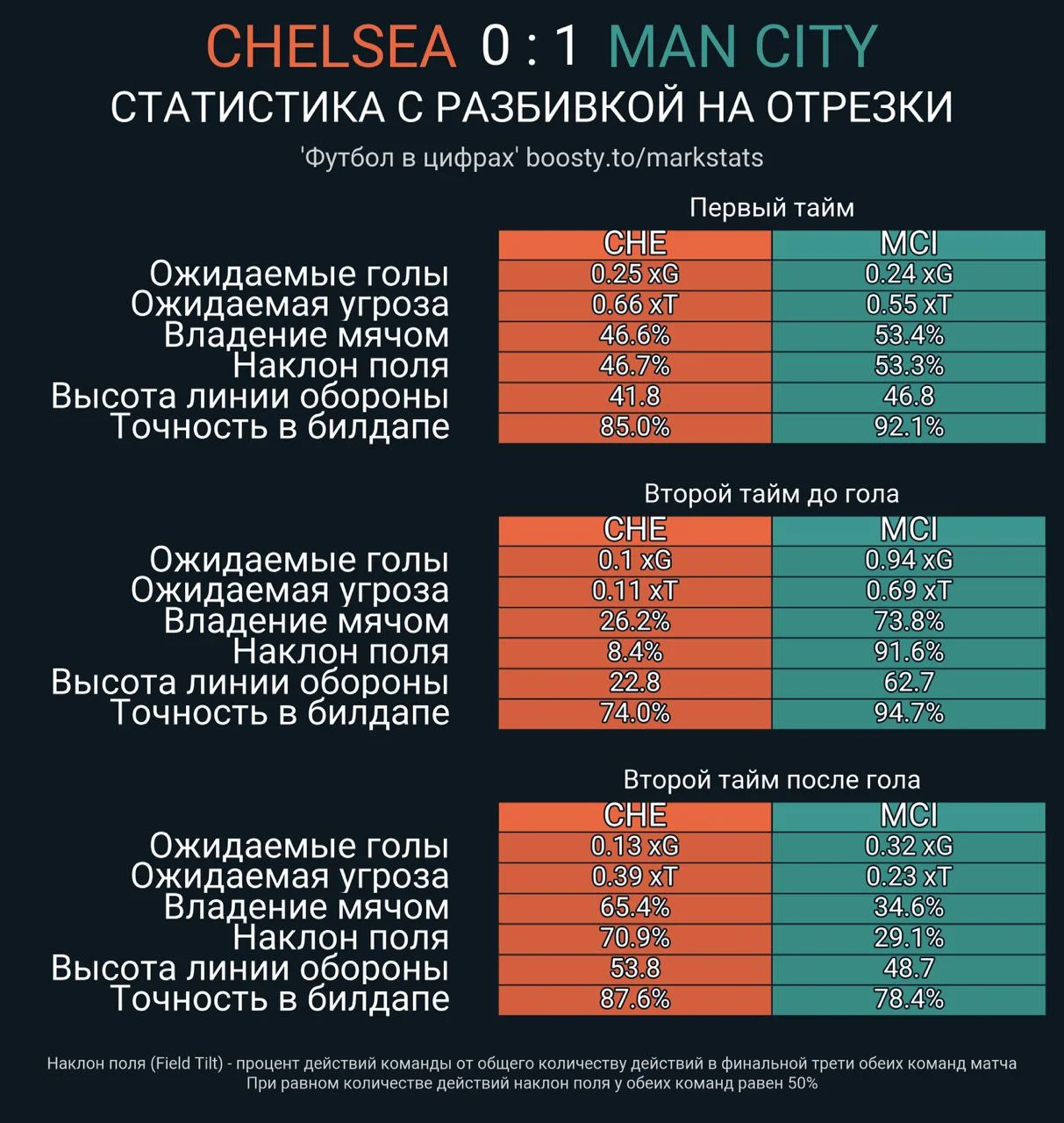 Після подвійної заміни на старті другого ситуація змінилася докорінним чином. Перестановки на правому фланзі стабілізували ситуацію в захисті, а після появи Фодена й Аканджі на полі був той же склад, що і в попередньому матчі. Статистичні показники виросли, і в другому таймі Сіті провів вже три моменти. Гол Мареза виглядав заслуженим, в той час як у Челсі залишився тільки момент після стандарту.