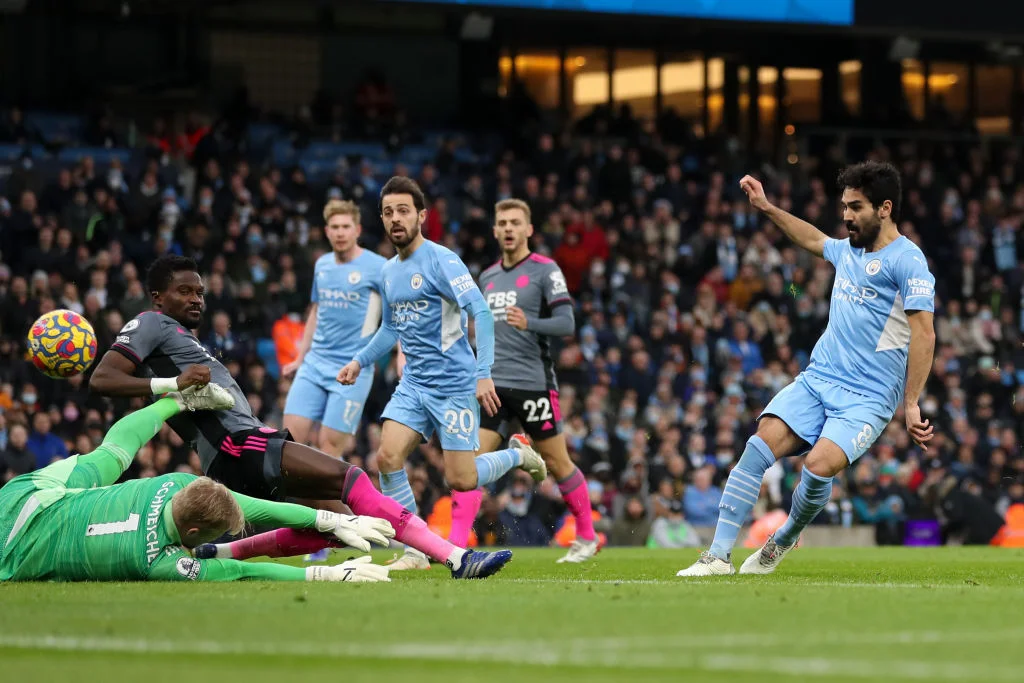 Здавалося, що зараз Лестер повернеться у гру, але на 21-й хвилині Сіті довів справу до розгрому. Бернарду Сілва змістився з флангу й викотив пас на Де Брюйне, той у дотик запустив передачу на правий край штрафного, а Канселу звідти прострілив – Шмейхель же при спробі перехоплення вибив м'яч прямо на ногу Гюндогану. Ілкай одразу розстріляв ворота. 3:0!