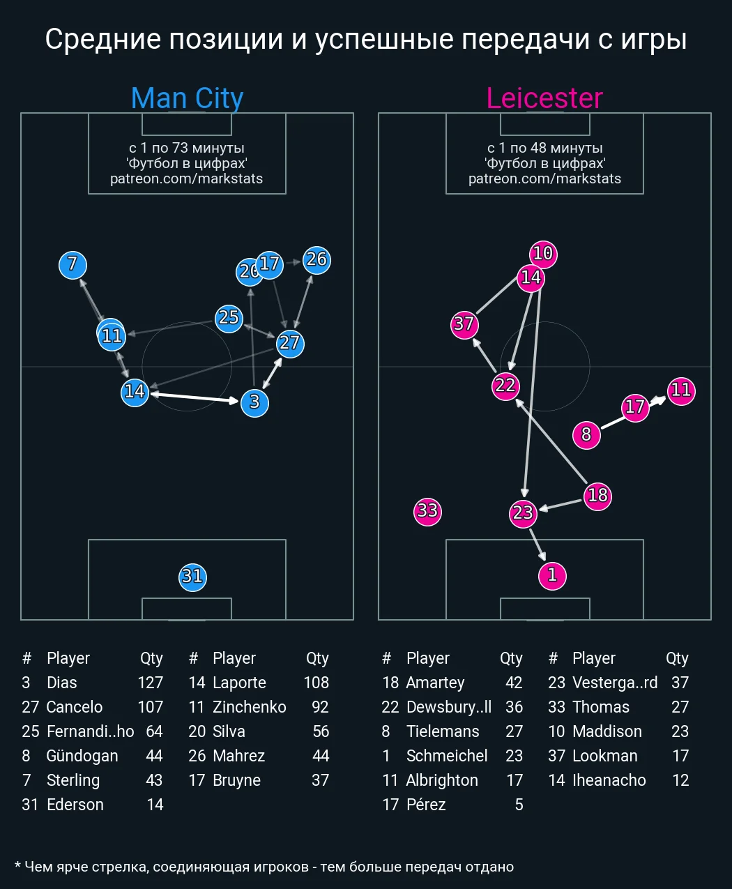 Взагалі, тактичні аналітики пов'язують проблеми Сіті в другому таймі із відсутністю злагодженості між Канселу, Зінченком і Фернандінью в центрі поля. Вона проявлялася у дрібних епізодах (передача опіки, підстраховка, перевантаження зон, тощо) й призводила до розривів, через які група атаки "містян" залишалася ізольованою. Лестер же майстерно контратакував.