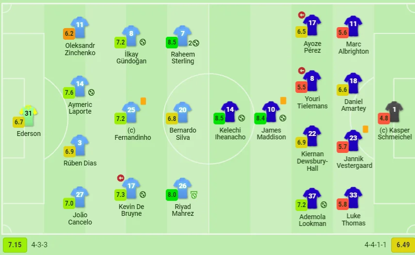 Нічого не віщувало проблем для "містян", однак у наступні 13 хвилин Лестер зміг шокувати публіку на Етіхаді. Так, на 55-й хвилині гості розмочили рахунок внаслідок контратаки 3-в-1, яку започаткував Кастань – а Меддісон та Іхеаначо розігнали й завершили її. Келечі відпасував Джеймсу під вихід віч-на-віч, а той легко реалізував епізод. 4:1.