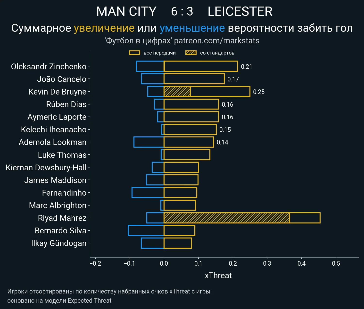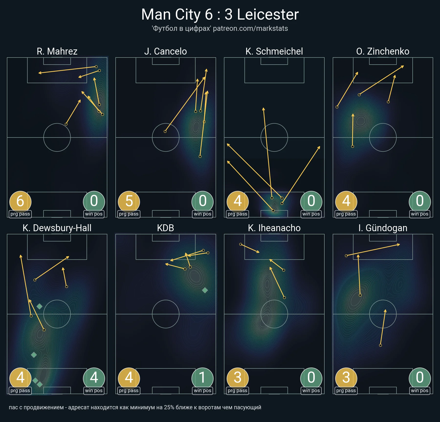 Вплив Сашка в позиційній атаці виявився серйозним. По-перше, він був значно активніше залучений до неї, ніж Гюндоган, Канселу чи Стерлінг – українець набив 0,08 xGBuildUP (більше тільки у Фернандінью та Едерсона). По-друге, Зінченко став лідером матчу за сумарною гостротою пасів з гри.