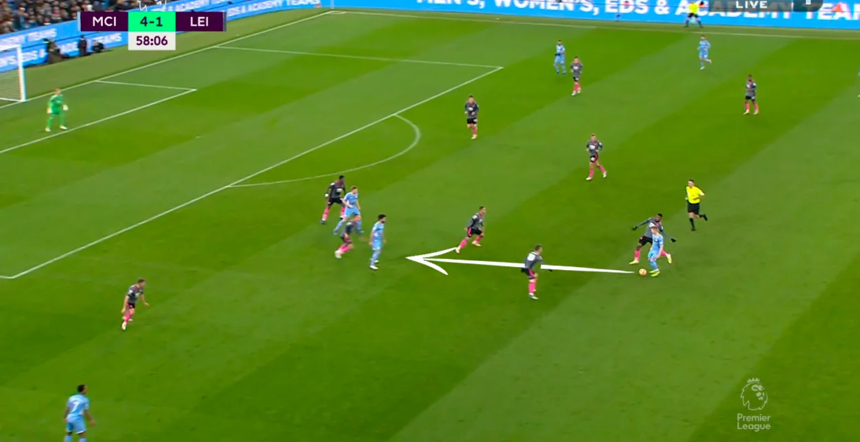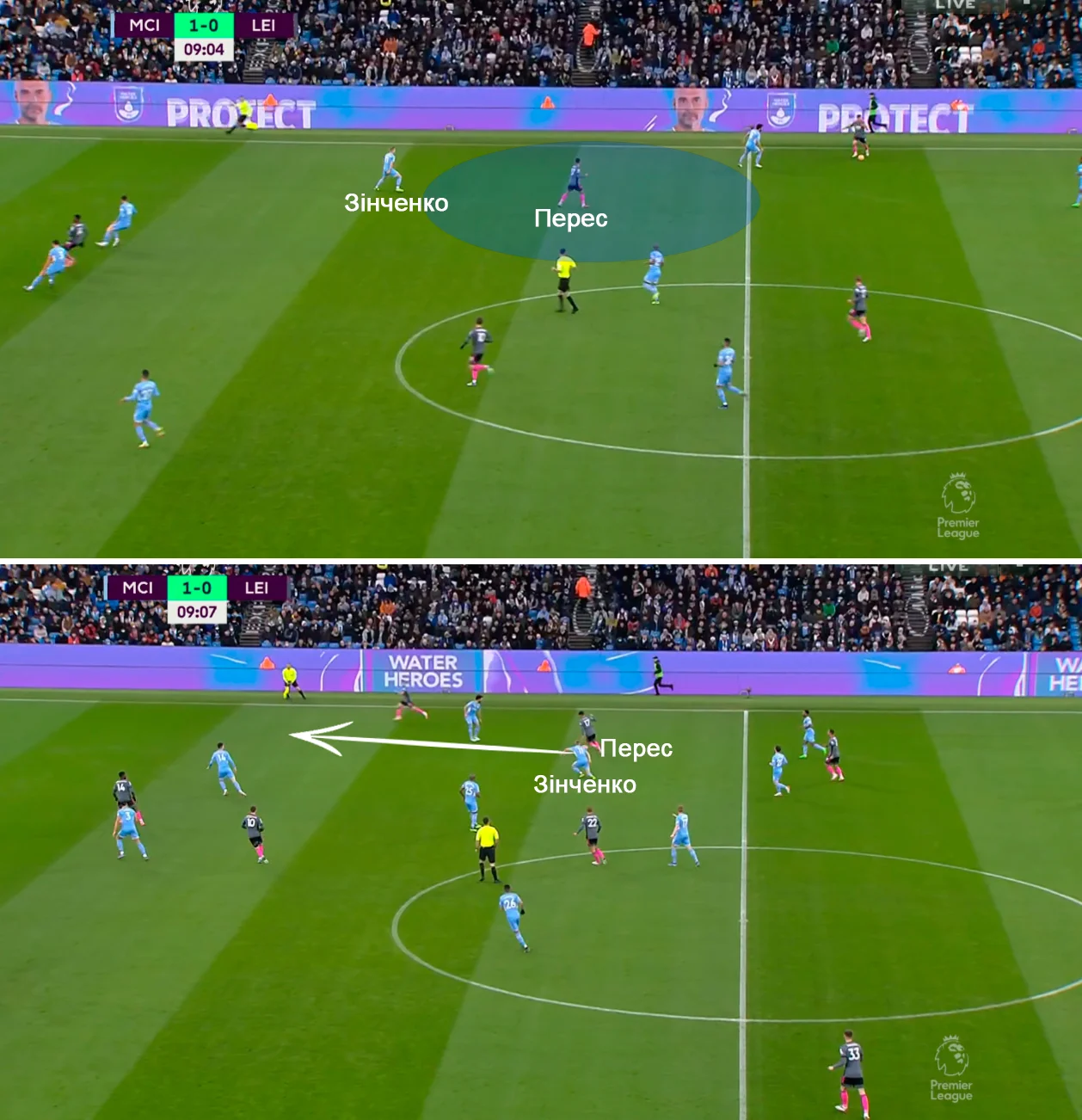 Оцінки від Whoscored варто викинути на смітник. Перш за все, важливо зрозуміти завдання футболіста на полі. Зінченко у поєдинку проти Лестера виконував традиційну для себе роль фальшивого фулбека, зміщуючись у центр за потреби чи можливості. Їх ніколи не виникало при білд-апі Сіті, коли Фернандінью сідав у зону над центрбеками, а Бернарду підтримував його в центрі – в цій фазі крайні захисники розбігались по флангах.