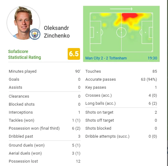 Відзначився перехопленням, а його єдиний підкат був вдалим. За точністю передач став 3-м серед усіх гравців – 94%. Тільки в Ляпорта (96) і Родрі (98) кращий відсоток. Водночас Зінченко став третім у Ман Сіті за втраченим володінням (12). Лише де Брюйне і Стерлінг грішили цим частіше. Ну, і 2 виграні єдиноборства з 8-и – треба підтягувати свої показники.