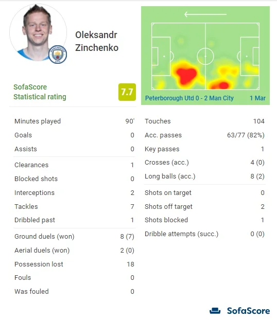 Олександр Зінченко отримав від Sofa Score оцінку 7.7. Це найвищий бал серед захисників і 4-й найкращий у матчі.