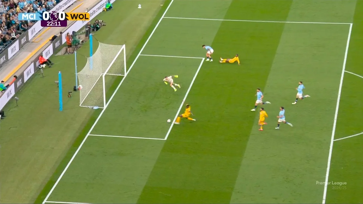 Манчестер Сіті дзвіночок почув. Головною зброєю господарів став Доку, який на швидкості знищував опікунів. Бельгієць вивів на ударну позицію О'Райлі, однак Са витягнув з-під поперечки. На 35-й хвилині "вовків" вже не врятувало ніщо. Бернарду "перекусив" Андре і розігнав контратаку. Нестримний Доку замахом прибрав Догерті та покотив в центр карного майданчика. Де Брюйне одним дотиком забив один з останнх голів (а може й останній) за Ман Сіті.