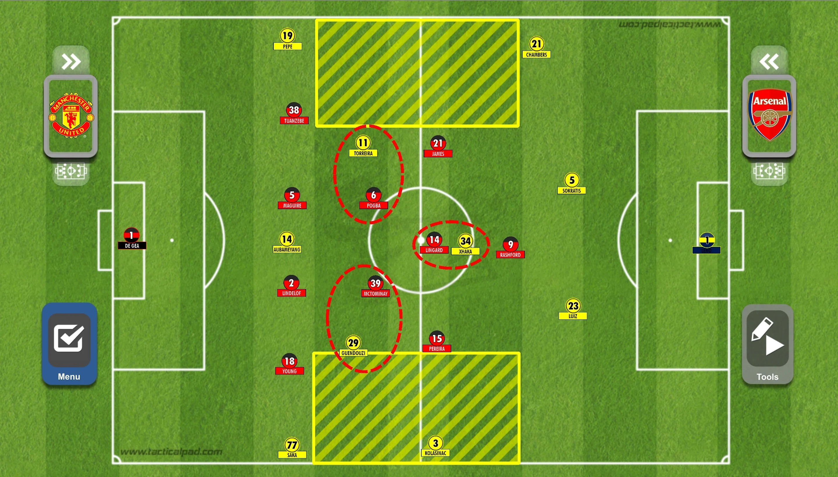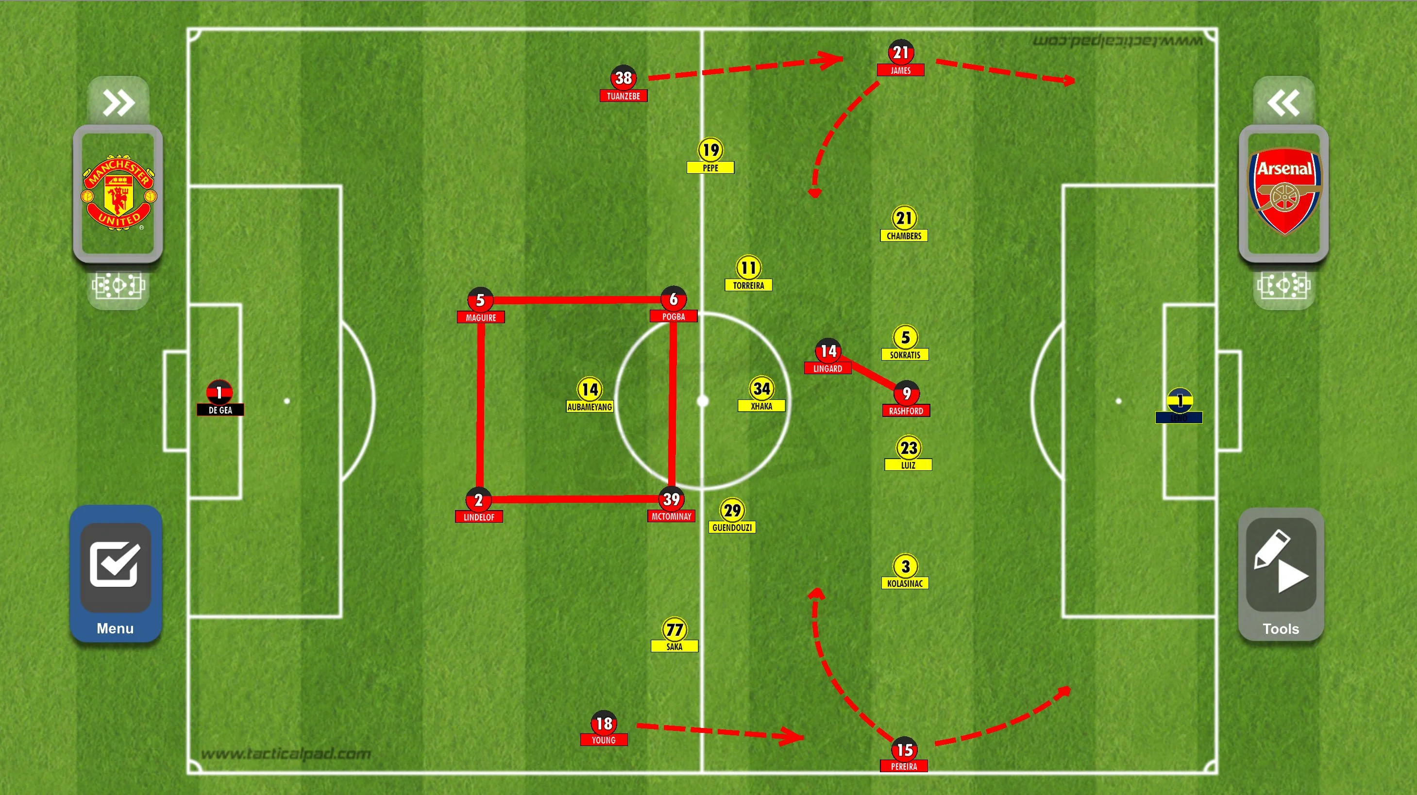 В тактичному плані це було хороше протистояння. Манчестер Юнайтед підготувався, сформувавши у центрі явну більшість і через неї будуючи свій білд-ап – як правило, це були довгі переведення в останню третину поля. В обороні ж вона утримувала компактність, ізолюючи від півзахисту Арсенала швидкісного Обамеянга. Статистика опорників говорить про непогану ефективність такого підходу – у Мактоміная та Погба на двох 7 відбирань, 18 виграних єдиноборств, 14 повернень м'яча та 3 ключові передачі та 8 точних довгих пасів (з 13-ти). Обамеянг залишався непомітним.
