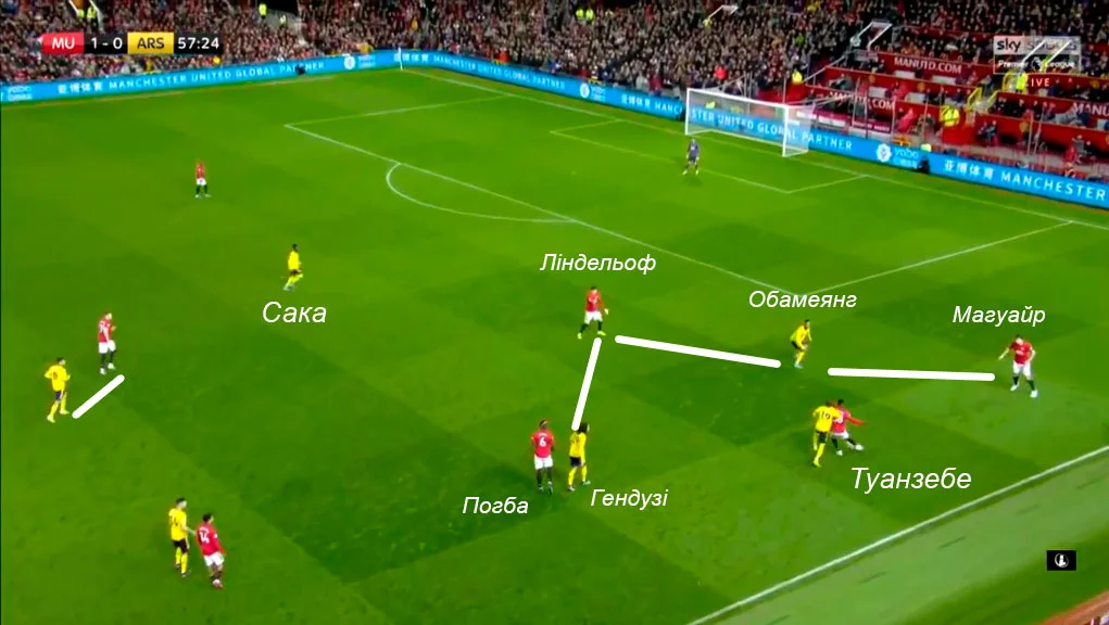 Все почалося з Туанзебе, який викотив передачу в центр прямо в ноги Сака. Той одразу ж запустив м'яч у вільну зону перед штрафним на Обамеянга, а габонець, вирвавшись віч-на-віч з Де Хеа, впевнено переграв його – 1:1! Щоправда, арбітри спочатку просвистіли офсайд, але VAR врятував справедливість. Обамеянгу до офсайду було метрів шість. На 60-й же "каноніри" могли провести і другий гол, однак постріл Сака з центру карного майданчика після кросу з правого флангу рикошетом від Ліндельофа пролетів над поперечкою.