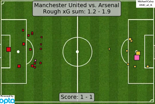 Манкуніанцям вдалося заспокоїти гру, а потім і перехопити ініціативу – не в останню чергу завдяки далеко не найкращому виходу Себальйоса, який увімкнувся ближче до завершення поєдинку. "Червоні дияволи" створили низку моментів і були близькими до другого голу, але загалом реальний тиск господарів виявився недовгим – гості осідлали його вже з другої половини 70-х хвилин. Вихід Фреда та Грінвуда гру МЮ аж ніяк не посилив. "Канонірам", звісно ж, довелося трішки потерпіти, але вони так і не дали увійти у власний штрафний, змусивши Манчестер Юнайтед збиватися на удари з дистанції, з гострих кутів або після стандартів. Саме тому сумарний xG МЮ нижчий, ніж у Арсенала.