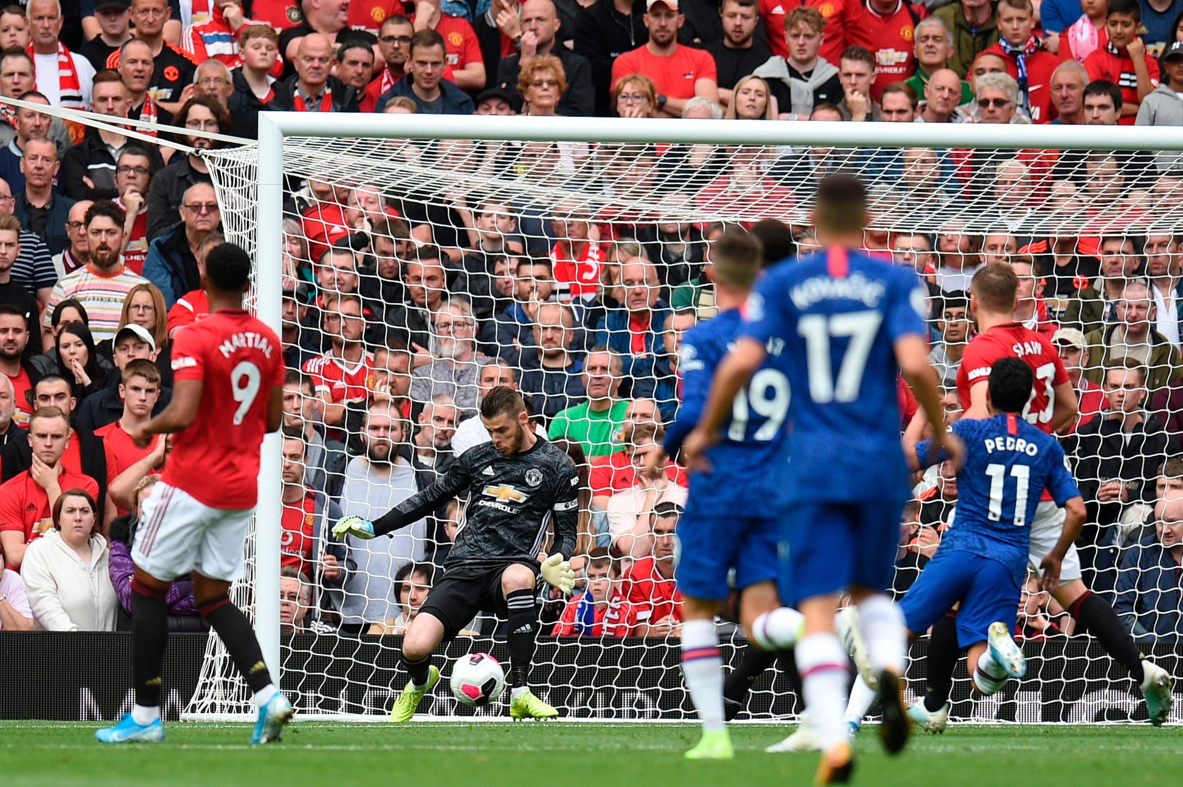 На початку другого тайму поле "Олд Траффорд" рясно полив дощ, що збільшило кількість порушень правил – в перші 15 хвилин арбітр Ентоні Тейлор показав три жовті картки! Якість моментів при цьому була невисокою: у Манчестера було кілька стандартів без загострення, а Челсі відповів двома дальніми ударами – Педро метрів з 25-ти з рикошетом пробив над воротами, а Емерсон потужним пострілом з лінії штрафного змусив Де Хеа рятувати МЮ.