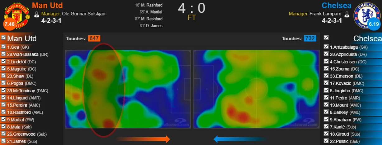 Саме в цей період прояснився той футбол, який бажав демонструвати Сульшер: його команда опускалася понижче, закривала зони позаду, страхувала Погба та вибігала в доволі прості контри. Ця картина спостерігалася протягом всієї гри, про що свідчить теплова карта – основна частина матчу пройшла саме в тих зонах, звідки Юнайтед розпочинав свої контрвипади.