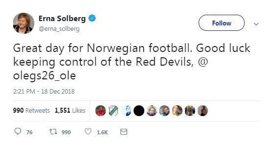 Варто відзначити, що прем'єр-міністр Норвегії Ерна Сольберг вже привітала Сульшера у Twitter, але цей пост згодом теж було видалено.