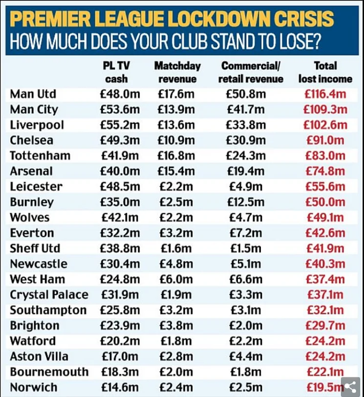 Видання опублікувало таблицю фінансових втрат за трьома джерелами доходу – телебачення, заробітки в день матчу та комерційна діяльність. Найгірші справи у Манчестер Юнайтед. "Червоні дияволи" отримають "діру" у розмірі 116,4 млн фунтів. До слова, приблизно стільки коштує вінгер Борусії Д Джейдон Санчо, якого називають головною ціллю МЮ на літо. До трійки також увійшли Манчестер Сіті (109,3 млн) та Ліверпуль (102,6). Найменші збитки у Норвіча – "всього" 19,5 млн фунтів.