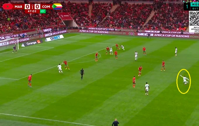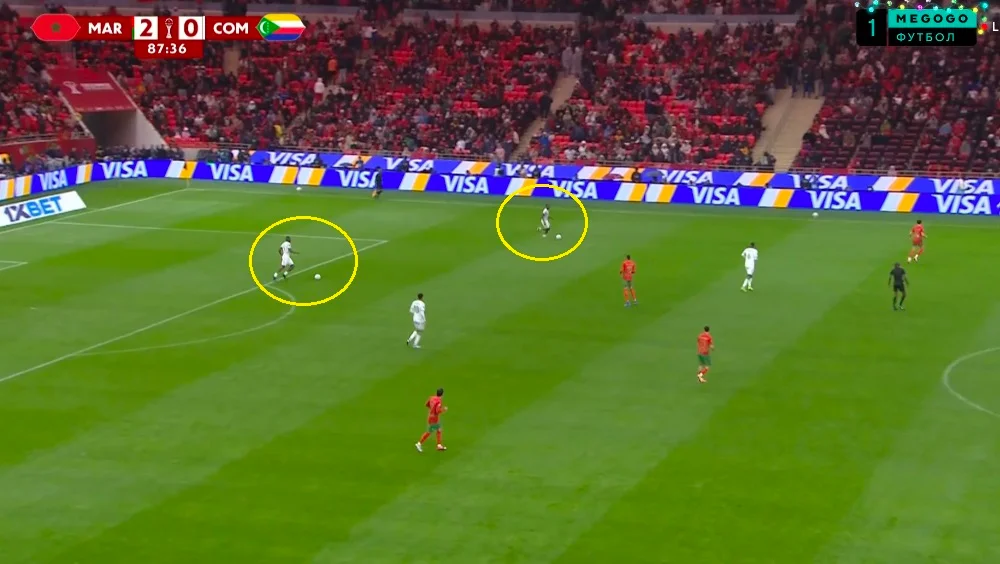 Звісно ж, за такого футболу проти Марокко багато не створити, але три з чотирьох ударів Коморців могли завершитись голом. Один із них пройшов зі стандарту з 40 метрів (!), долетівши до воріт Буну. Ясін настільки не очікував на цей постріл, що не зміг зафіксувати м'яч у руках. Сфера відскочила поміж ніг, однак голкіпер одразу ж накрив її.