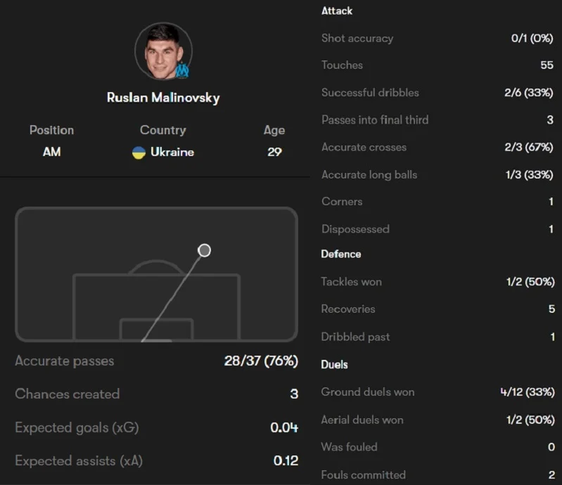 Що українець точно зробив, то це відборовся з усіх сил. Маліновський не цурався чорнової роботи, допомагаючи обороні. Став одним із лідерів за кількістю спроб відібрати м'яч (3) та блокувань (4). Дуже часто намагався йти у дриблінг, але лише 2 спроби із 6 стали успішними. Шансів використати свою головну зброю в цьому матчі не було. Руслан лише одного разу пробив по воротах (звісно, здалеку). Це сталося перед самісінькою заміною. Вийшло дуже неточно.