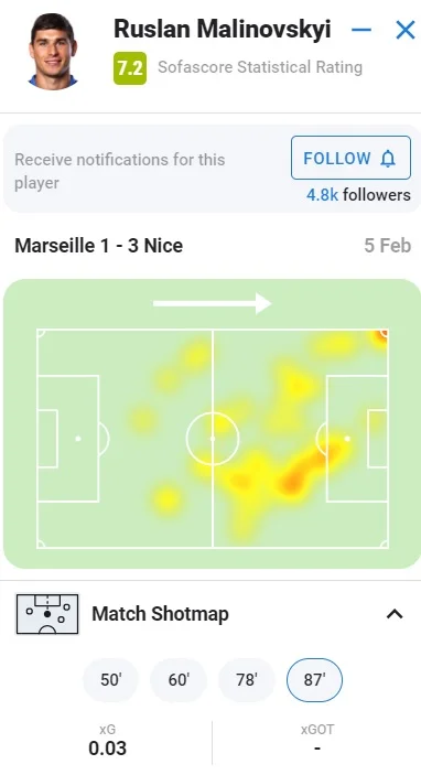 Ігор Тудор не міг миритися з такою ситуацією і провів 2 заміни у перерві. Маліновський/Санчес вийшли замість Пайє/Вітіньї. Гра Марселя відразу стала жвавішою, а Руслан виділявся ледь не найбільше. Українець могутнім ударом перевірив на міцність корпус Тодібо, також якісно виконував стандарти. На 60-й хвилині Маліновському нарешті пощастило забити перший м'яч за Марсель. Клос пронісся флангом і викотив передачу в район пенальті, де була порожнеча і українець. Чіткий удар з улюбленої лівої – 1:2.
