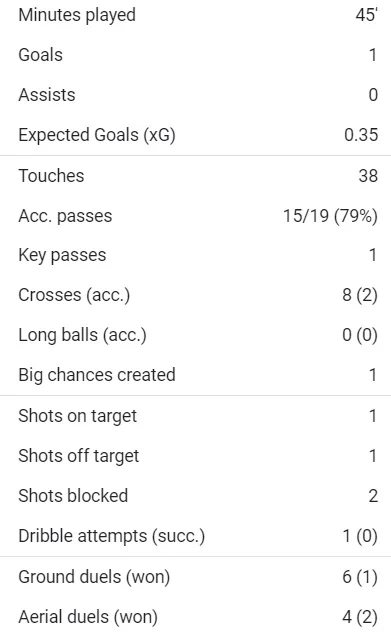 Індивідуальний виступ Маліновського слід оцінити позитивно. Українець відразу загострив гру і за тайм напрацював на другу найкращу оцінку у команді від SofaScore – 7,2 (у Клоса 7,3). Руслан бив за першої-ліпшої нагоди, мав одну ключову передачу. Відставання у рахунку змушувало ризикувати, що призвело до великої кількості браку.