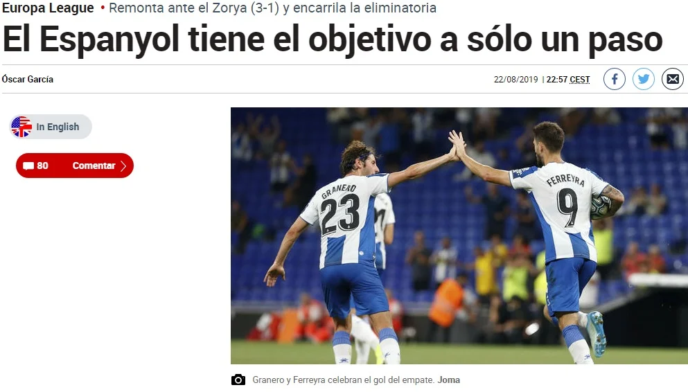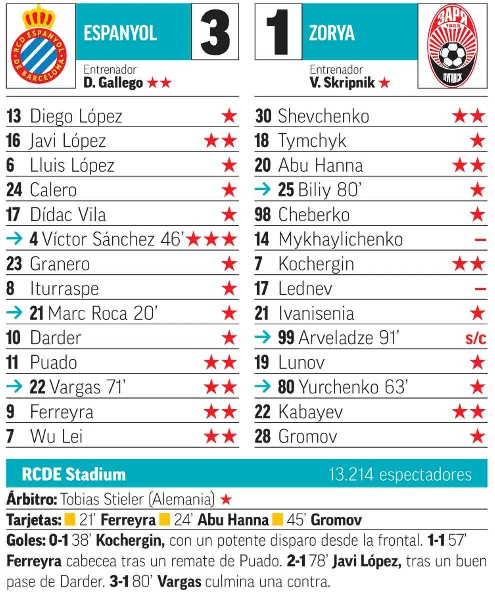 Європа завжди дарує нам пам'ятні камбеки, тут панує особлива атмосфера змагання. Швидка, вертикальна Зоря зникла з поля лише після гола Феррейри, але це ще не був кінець. Шевченко виявився гігантом перед Гранеро, нагадавши про старих привидів сумних європейських ночей. Коли у двері постукала біда, своє слово сказав неочікуваний герой. Давід Лопес вивів господарів вперед, відзначившись першим м'ячем за 7 (!) років. А вже незабаром Варгас зробив перевагу "папуг" більш-менш комфортною. Ейфорія! Залишилось 90 хвилин, щоб повернутись у Європу", – йдеться у звіті AS.