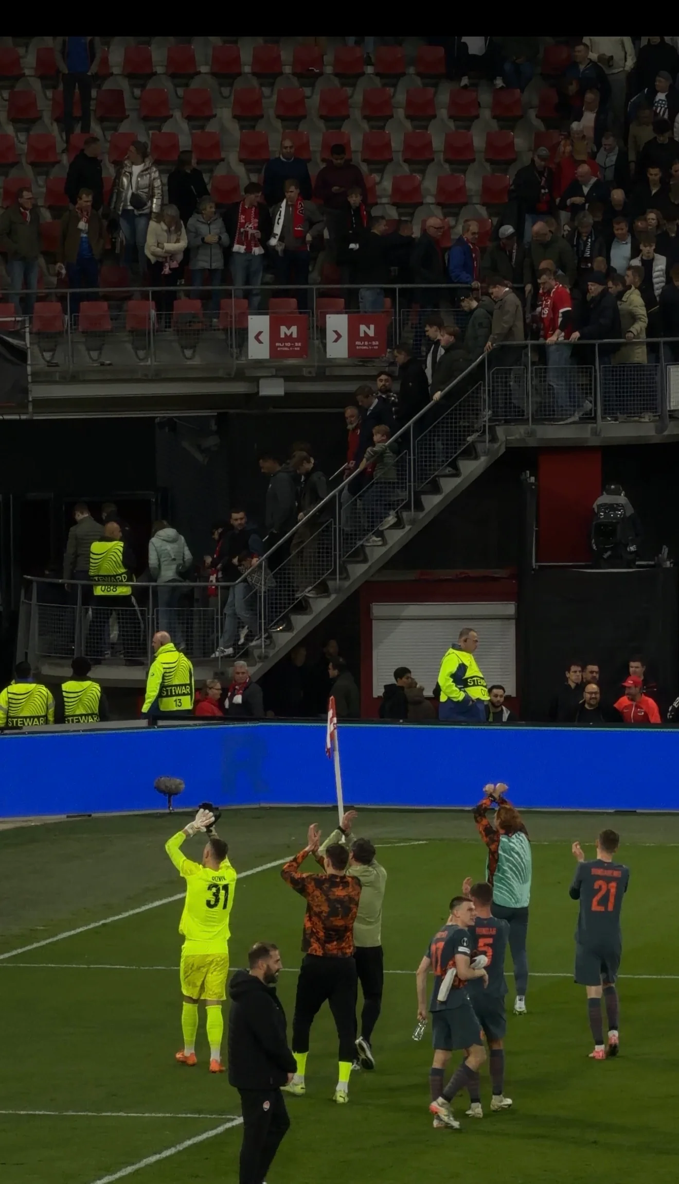 Атмосфера загалом була продумана до деталей – музика, її гучність, постійні вигуки, кольори. Усе це створювало тиск, у якому доводилося грати Шахтарю. Але фан-сектор відповідав – його було добре чути, і в певні моменти ця підтримка вирівнювала баланс. Місцеві журналісти навіть діставали телефони, знімали й активно обговорювали скандування – для них це було більше, ніж просто футбол.