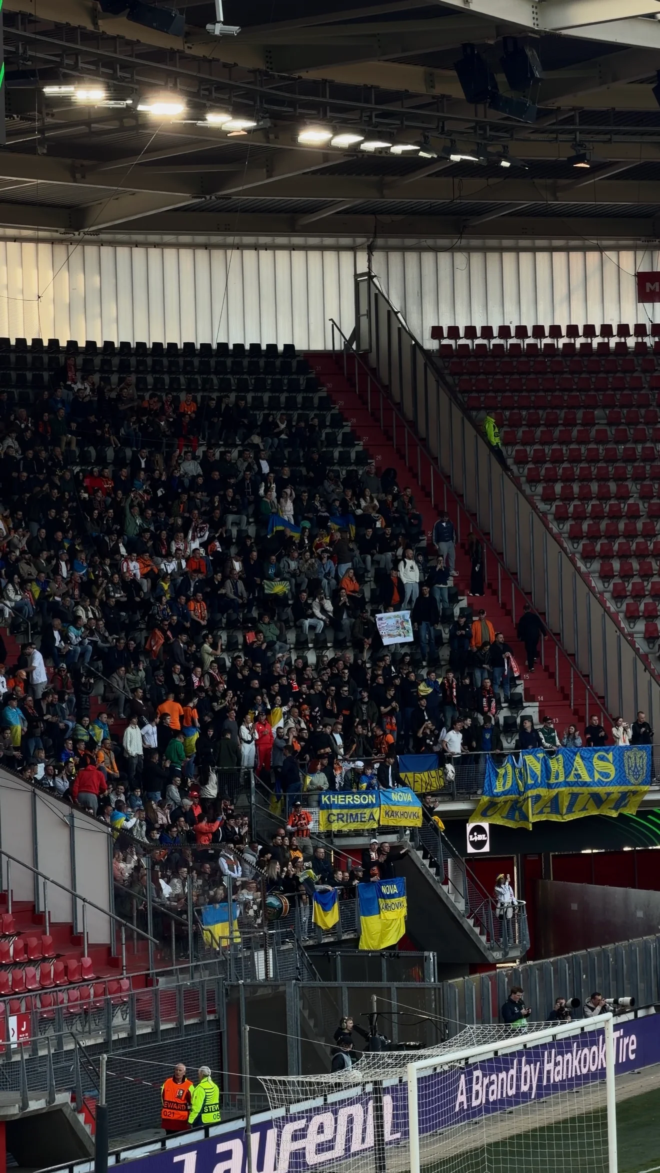 Поступово заповнювалися трибуни. Фан-сектор Шахтаря налічував близько 950 людей, але українців було більше – їх можна було побачити по всій арені. Формально це порушення, адже з атрибутикою дозволено перебувати лише у своєму секторі, однак зауваження лунали виключно від працівників стадіону – жодної негативної реакції від місцевих уболівальників.