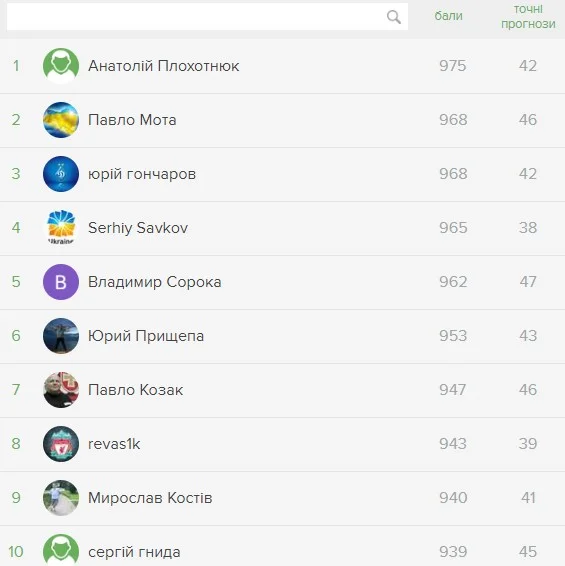 Насичений серпень закінчився, отже настав час вшановувати трійку юзерів, які виявились найстабільнішими на марафонській дистанції довжиною у 31 день. Абсолютним чемпіоном став Анатолій Плохотнюк – 975 очок. Павло Мота ще й тут приміряв лаври віце-чемпіона – 968 балів. Стільки ж очок набрав Юрій Гончаров, проте за додатковими показниками (46 точних прогнозів проти 42) посів третю сходинку.