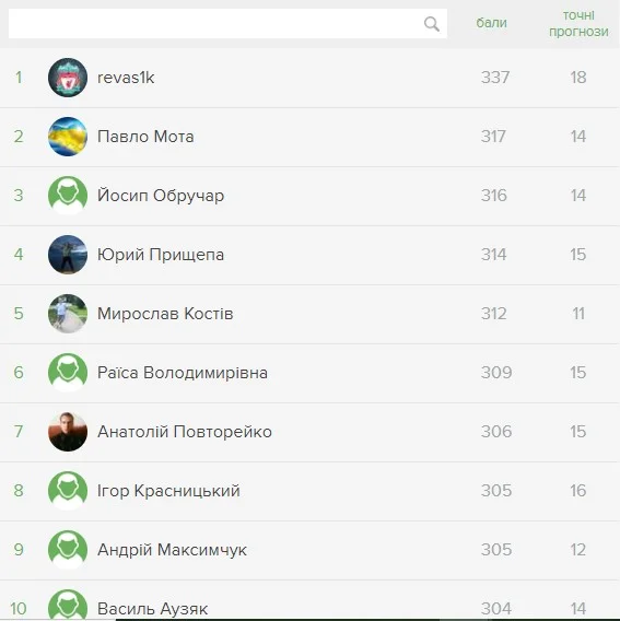 Чемпіоном тижня стає revas1k. Юзер, який порівняно нещодавно долучився до нашого конкурсу (трохи більше 10 тисяч прогнозів), набрав 337 очок, на цілих 20 балів відірвавшись від найближчого переслідувача. Судячи з аватарки, вболіває цей учасник за Ліверпуль. Дуже вдалий вікенд для червоної половини Мерсисайду!