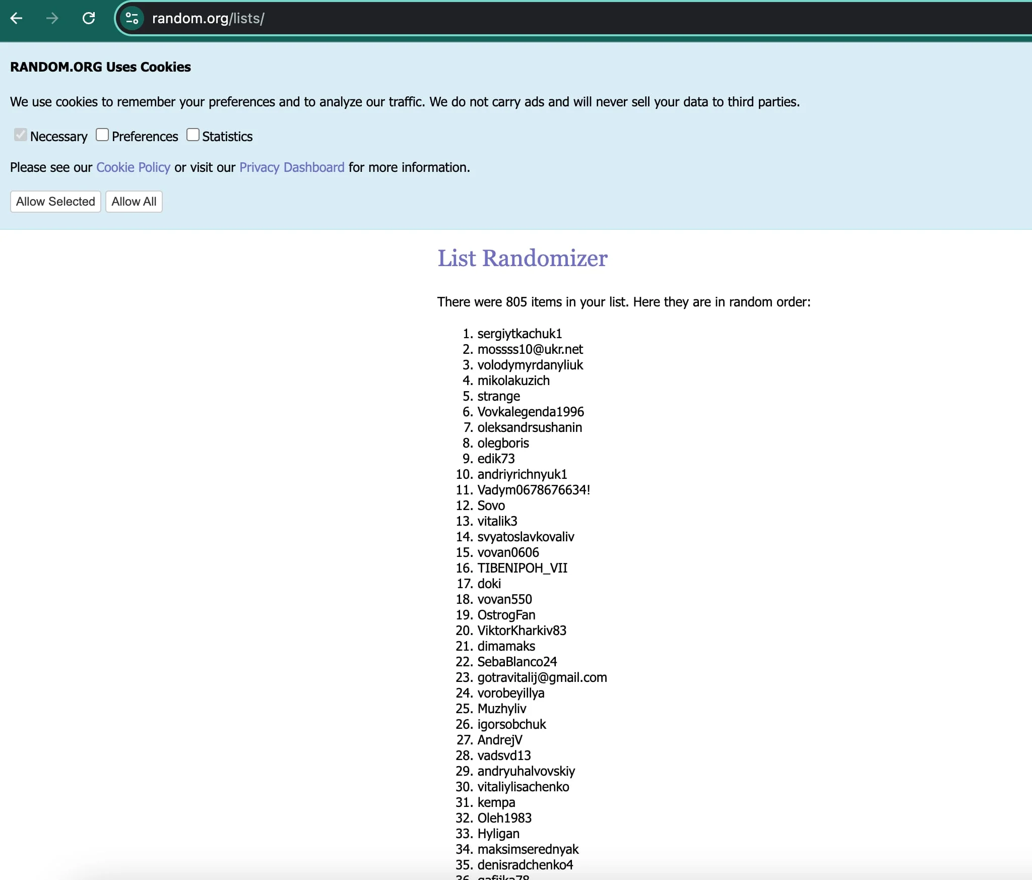 Окрім того ми розіграли 10 рандомних бонусів в еквіваленті 300 грн для випадкових учасників, які зробили упродовж місяця хоча б один прогноз. Random.org розсудив таким чином: