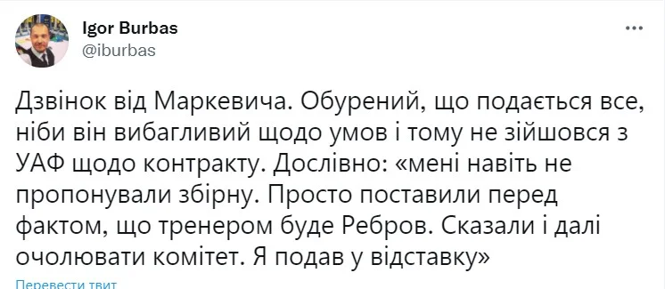 "Мені навіть не пропонували збірну. Просто поставили перед фактом, що тренером буде Ребров. Сказали і далі очолювати комітет (національних збірних України – прим.). Я подав у відставку", – зазначив Маркевич у розмові з Бурбасом.