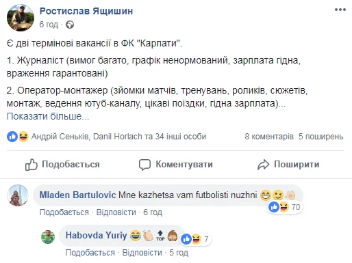 Бартуловіч, який виступав за Карпати у сезоні 2013/14, кумедно відреагував на інформацію про дві відкриті вакансії у львівському клубі – журналіста та оператора.