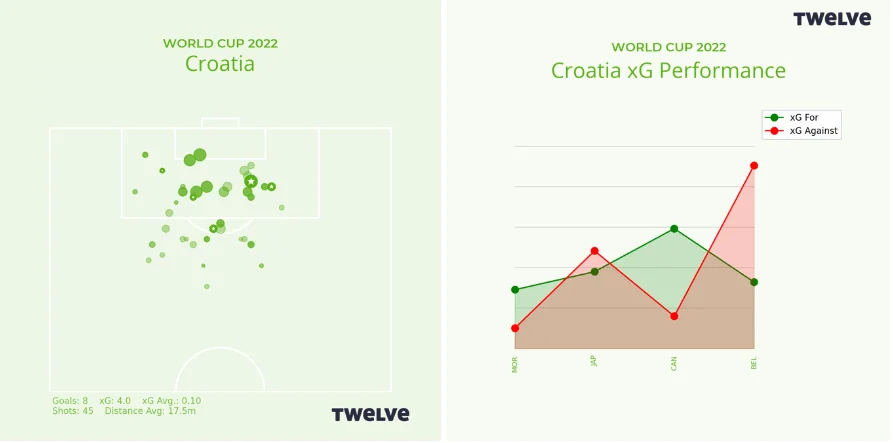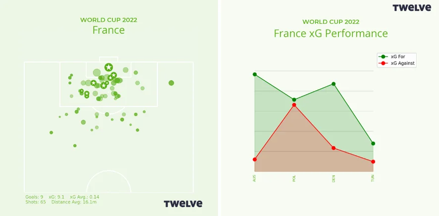 Команда Дешама набила аналогічний xG, що і підопічні Тіте (9,1). Проте на відміну від бразильців французи допускали до себе опонентів і ближче, і частіше. Особливо це було помітно з Польщею, але і безгольова поразка від Тунісу відповідала логіці подій на полі, хоча там грали відверто експериментальні резерви. Франція – найкраща серед чвертьфіналістів за середньою дистанцією пострілів (16,1 м). На 9 очікуваних голів створили, рівно стільки ж і забили.