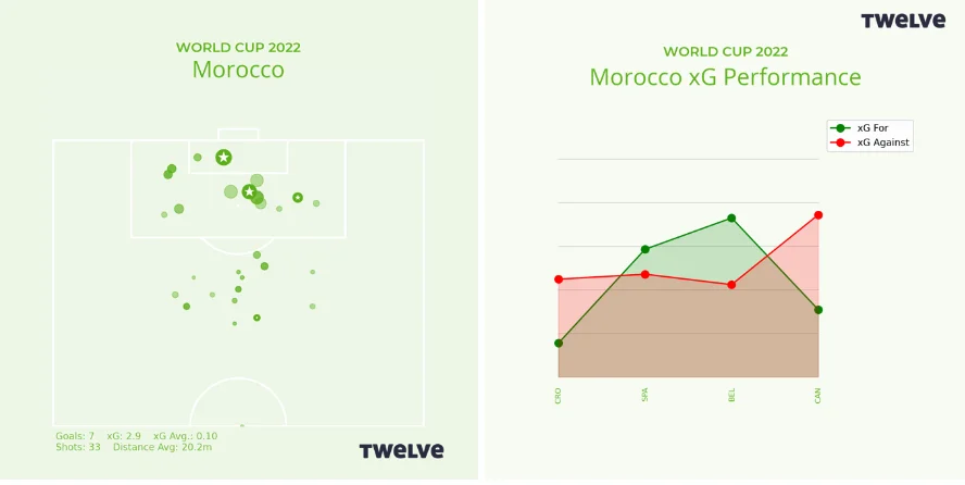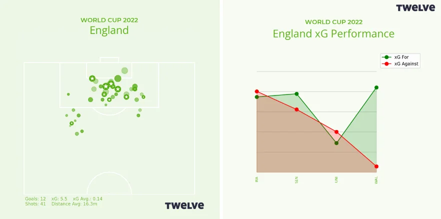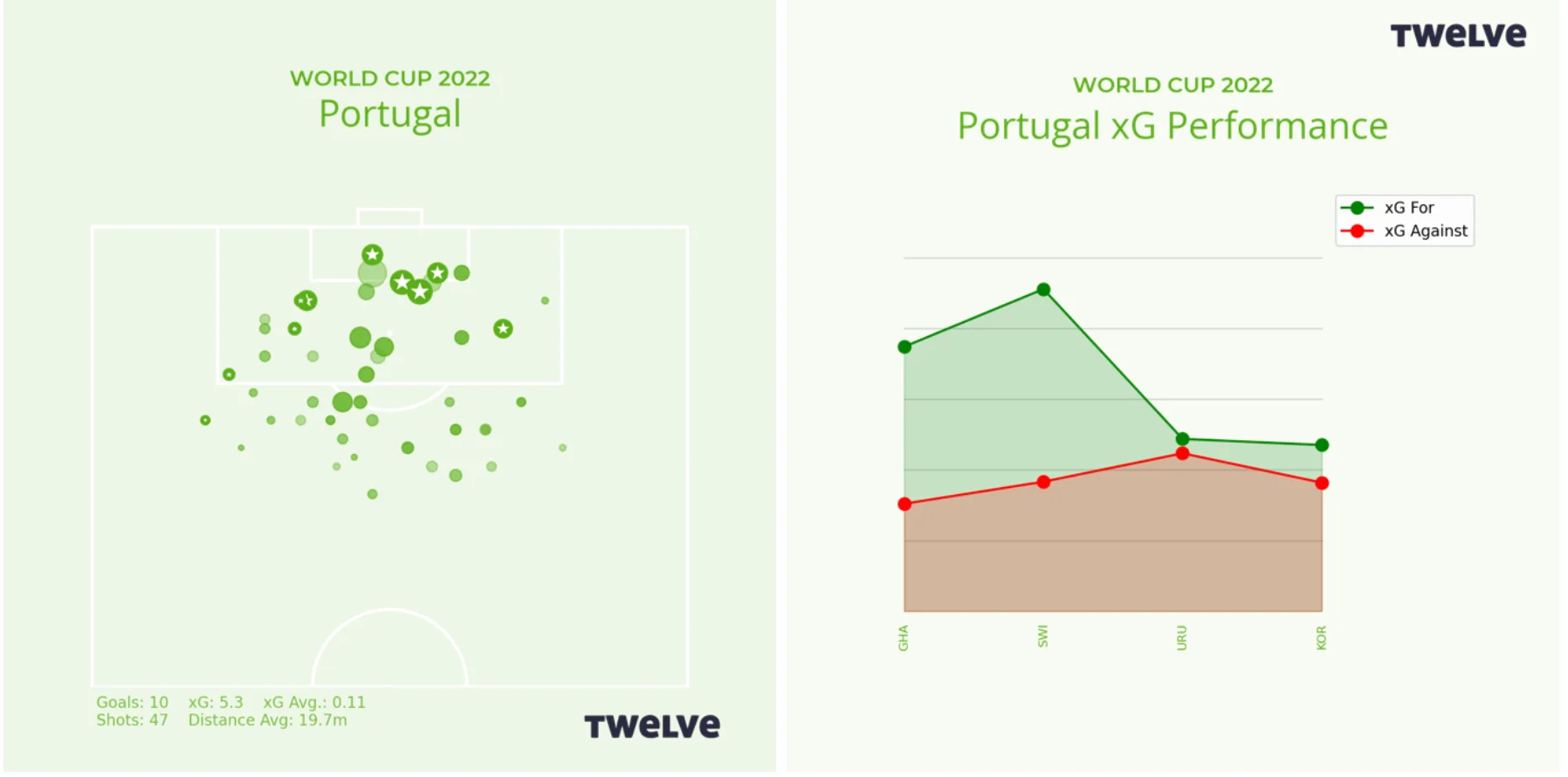 У всіх своїх матчах команда Сантуша переважала суперника за очікуваними голами. Як і Англія, португальці забили 12 голів (на графіці помилково вказані 10). Однак насторожує, що європейська "селесао" показує другу найгіршу дальність ударів (19,7 м). Відповідно середній xG удару (0,11) кращий лише за Хорватію та Марокко. Інший негативний момент – Португалія допускає 0,9 очікуваного гола на свої ворота за 90 хвилин. Завдяки сприятливому жеребові мають дійти до півфіналу та поборотися за медаль, але далі може не вистачити захисної якості проти таких машин, як Франція чи Англія.