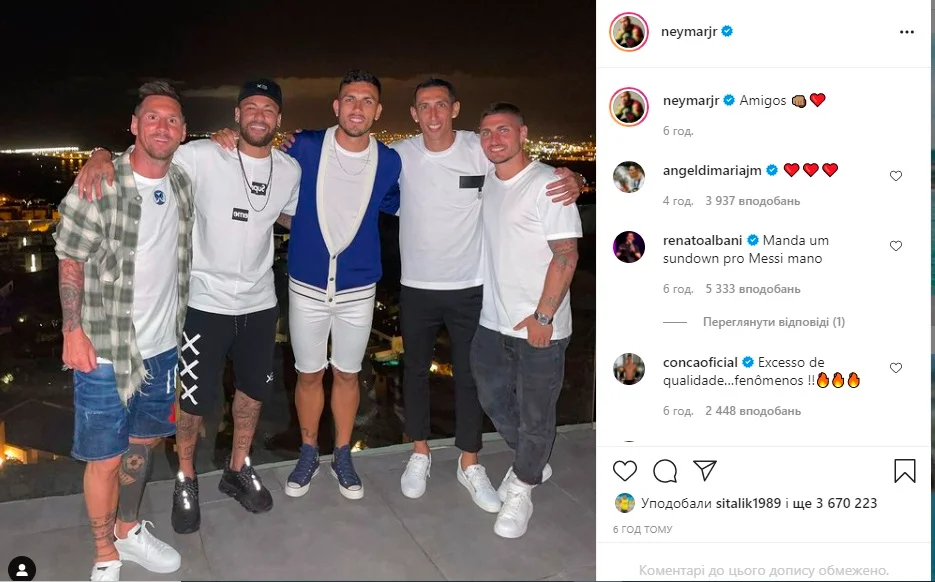 Бразильський форвард виклав у Instagram фото, яке обговорює вся Іспанія. На світлині позують Ліонель Мессі та четверо гравців ПСЖ – Неймар, Марко Верратті, Леандро Паредес і Анхель Ді Марія. Зауважимо, що двоє останніх разом із Мессі стали чемпіонами Копа Амеріка, а Верратті виграв Євро-2020 зі збірною Італії.