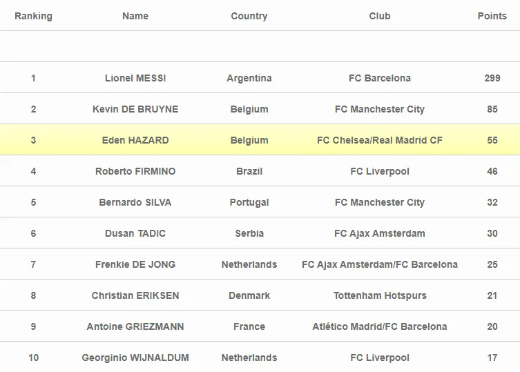Футбольні експерти віддали Мессі 299 балів, що принесло аргентинцю беззаперечну перемогу. "Срібний призер" Кевін де Брюйне отримав у три з половиною рази менше – 85 пунктів. Чільну трійку замкнув Еден Азар, якому нарахували 55 очок.