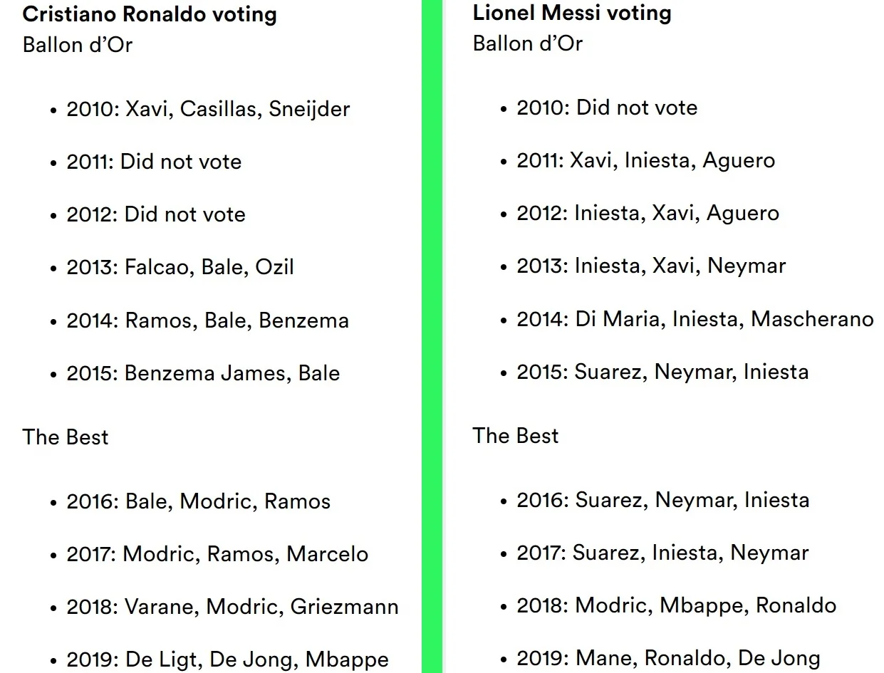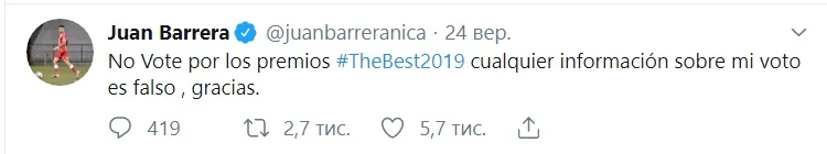 Першим про порушення заявив капітан збірної Нікарагуа Хуан Баррера, зізнавшись, що не голосував за нападника Барселони Ліонеля Мессі. Мало того хавбек Реала Естелі зовсім не брав участі у виборі найкращого. Про це він повідомив, розмістивши відповідний запис на свої сторінці у твіттері: "Я не голосував за FIFA The Best-2019, і будь-яка інформація про мій голос неправдива, дякую".