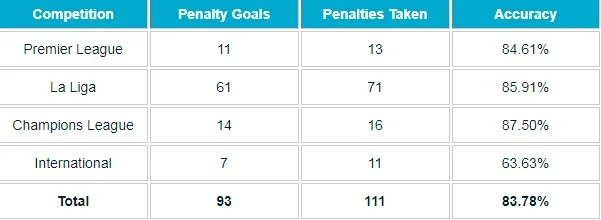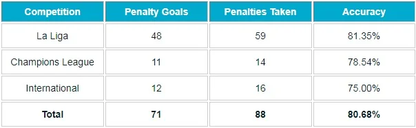 Загалом в офіційних матчах Мессі 88 разів виконував пенальті, забивши 71 гол (80,68%). Роналду пробивав з "позначки" 111 разів, відзначившись 93 м'ячами (83,78%).