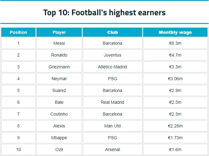 Найбільше серед футболістів у 2018-му році заробляв нападник Барселони Ліонель Мессі, прибутки футболіста склали вражаючі 8,3 мільйона євро на місяць.
