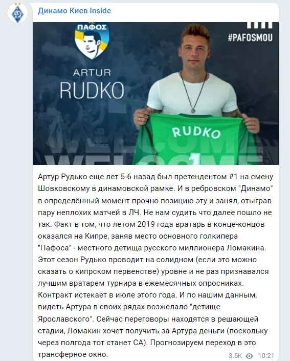 Металіст звернув свою увагу на Рудька, який наразі виступає за кіпрський Пафос, повідомляє Telegram-канал Динамо Киев Inside.