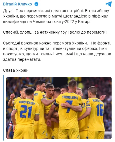 "Про перемоги, які нам так потрібні. Вітаю збірну України, що перемогла в матчі з Шотландією у півфіналі кваліфікації на чемпіонат світу-2022 у Катарі.