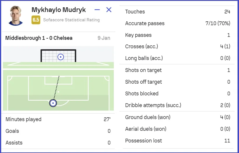 Мудрик в підсумку за півгодини 11 разів втратив м'яч і віддав 7 точних передач. Майже всі рішення на загострення були невдалими. Дві спроби дриблінгу – безуспішно, чотири дуелі – програно, чотири кроси у штрафний майданчик – лише один точний. Оцінка SofaScore не вражає – 6.5. Челсі програв, але ще не вилетів з Кубка ліги. 23 січня буде матч-відповідь.