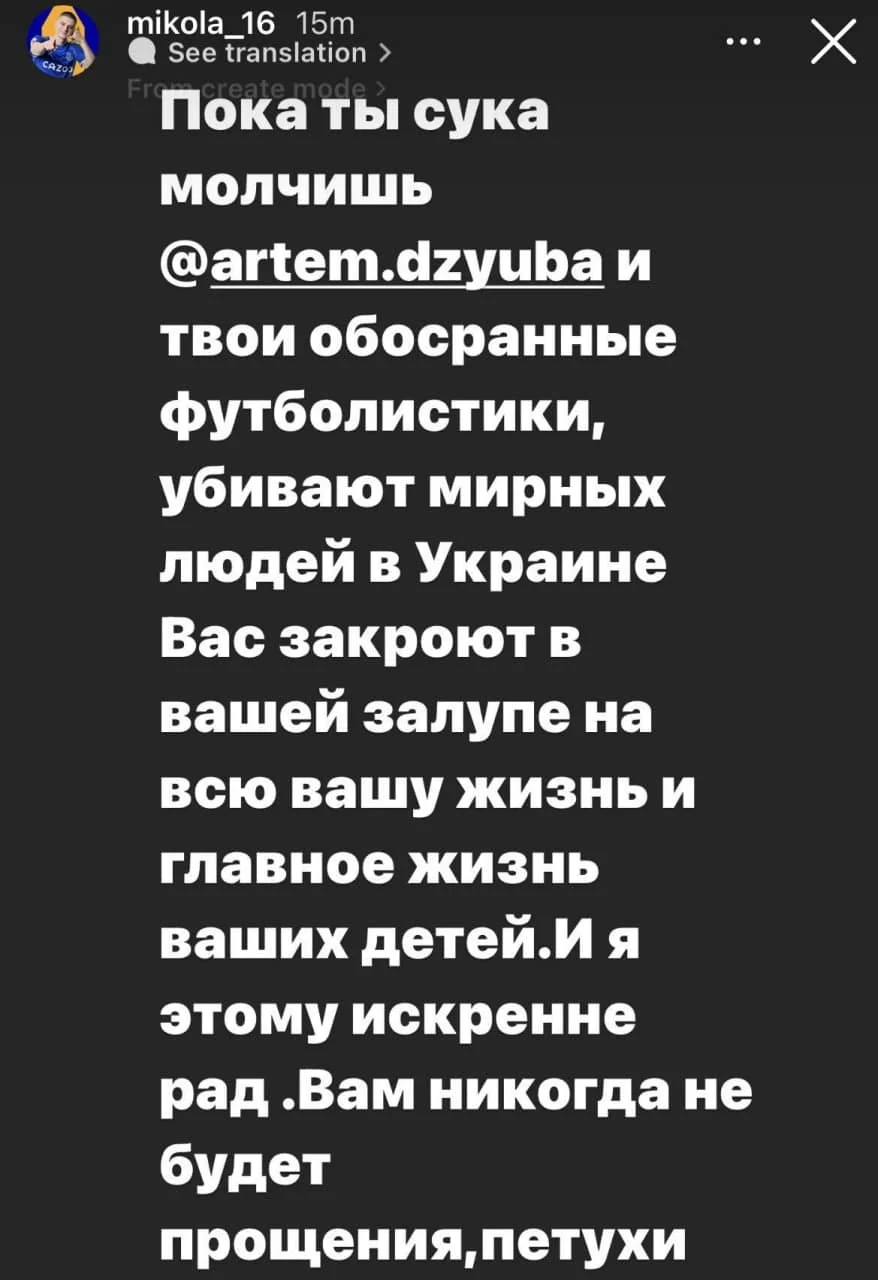 "Поки ти, Дзюбо, і твої обісрані футболістики мовчать, в Україні вбивають мирних людей.