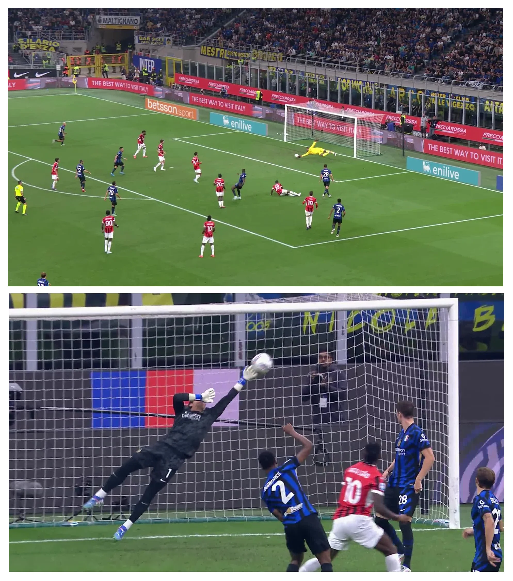Інтер продовжив тиснути й ближче до перерви міг виходити вперед. Дюмфріс створив момент для Тюрама. Маркус бив добре, але й Меньян зіграв чудово, важливий сейв. Він допоміг Мілану почати другу половину за рівного рахунку, а тут вже м'яч міг побувати у ворота Зоммера. Леау класно бив головою (так, це не помилка – Рафа класно бив головою), а швейцарець показав, що теж вміє рятувати.