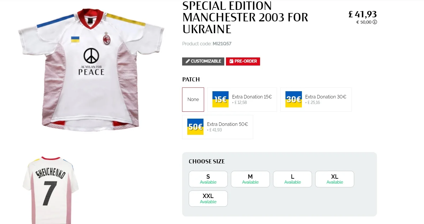 Клуб спільно з Андрієм Шевченком розробив унікальний варіант форми. Це копія екіпірування зразка 2003 року з окремими змінами – синьо-жовтими мотивами та написом "Мілан за мир". Придбати футболку буде можливість в офіційному онлайн-магазині з 11 березня. Ціна – 50 євро, ще додатково можна пожертвувати 15, 30 або 50 євро.