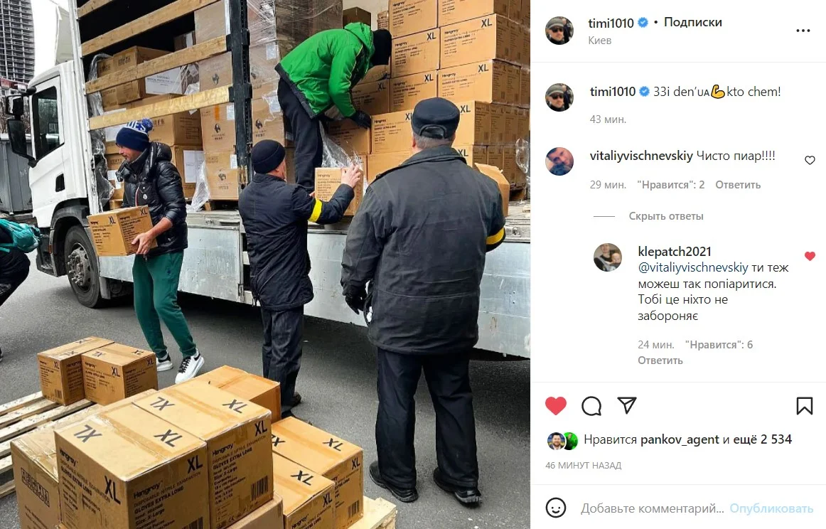 Екс-футболіст у своєму Instagram виклав світлину, на якій видно, як Артем допомагає носити коробки з гуманітаркою з вантажівки.