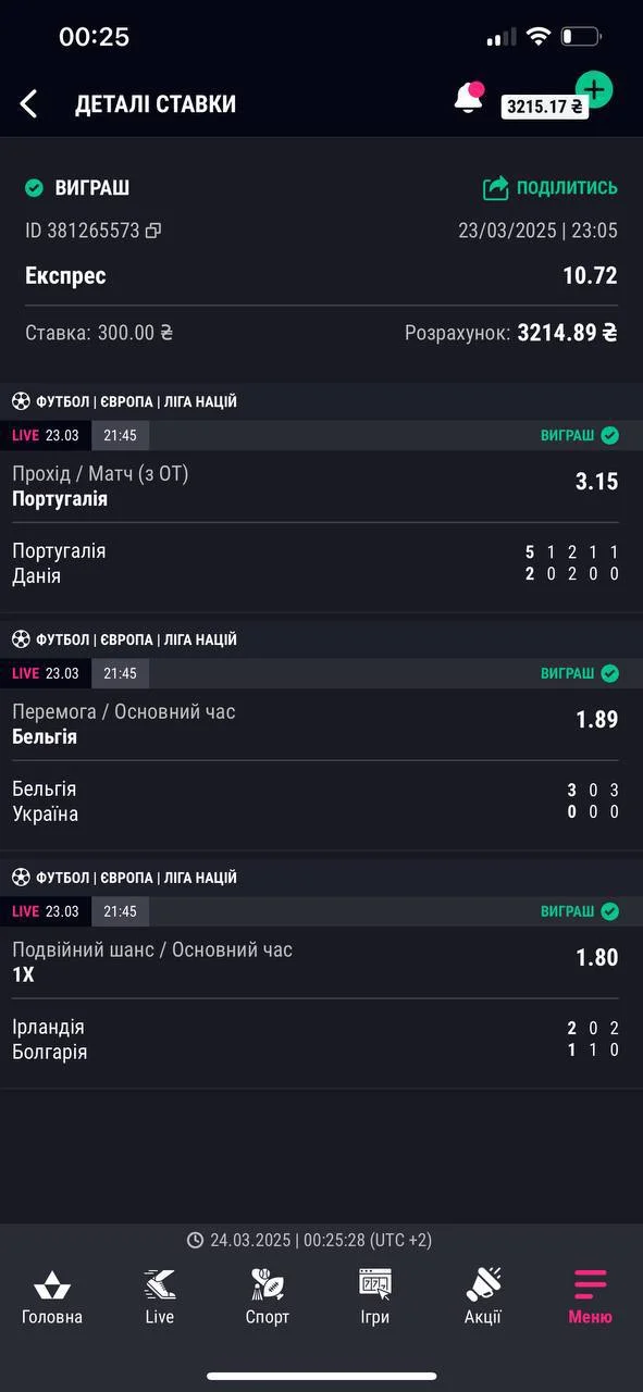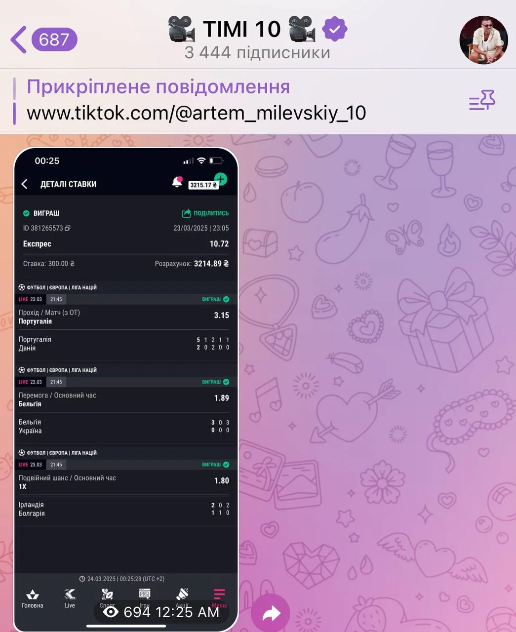 Артем Мілевський у своєму телеграм-каналі поділився цікавим зображенням. Екс-гравець Динамо в прямому сенсі заробив на поразці збірної України. Також експрес Мілевського включав прохід Португалії в дуелі з Данією та непрограш Ірландії проти Болгарії. Артем зумів виграти понад 3200 гривень, поставивши всього 300.