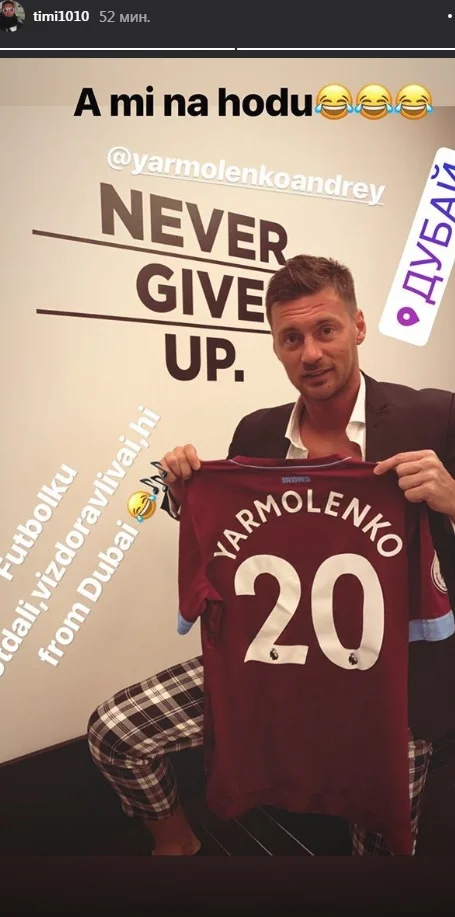 "А ми на ходу, Андрій Ярмоленко. Футболку віддали, видужуй, привіт з Дубай", – написав Артем Мілевський на фотографії.
