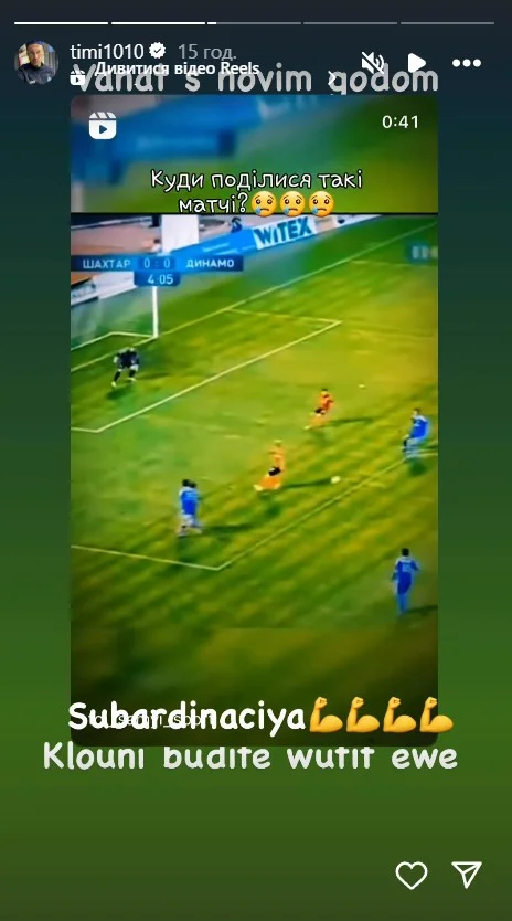 "Ванат, з Новим роком! Субординація! Клоуни, будете жартувати ще", – написав Мілевський в Instagram, репостнувши ретро-відео перемоги Динамо над Шахтарем, до якої долучився і сам Артем.