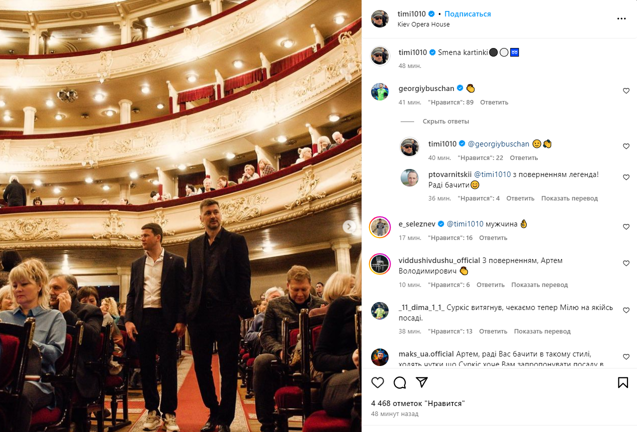 Колишній нападник збірної України Артем Мілевський потроху повертається до нормального життя. 38-річний екс-футболіст у своїх соцмережах виклав фото з Київської опери, яку він відвідав напередодні.