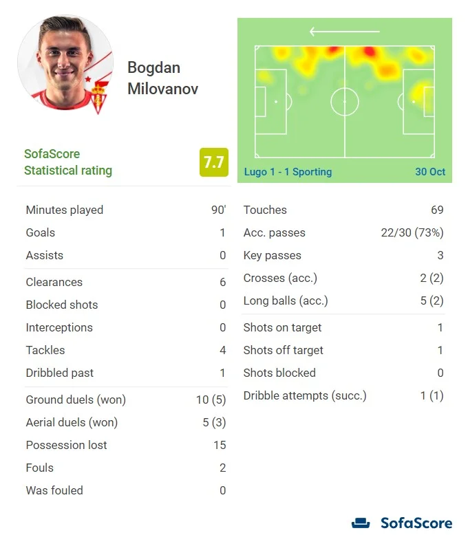 Відзначимо, що Богдан став найкращим гравцем Спортінга за версією Sofascore, набравши солідні 7,7 балів. Українець записав до свого активу гол та жовту картку, здійснив 6 підбирання, зробив 4 вдалі спроби відбори. Куди гірше ситуація у його партнера Василя Кравця – той набрав лише 6 балів, ставши найгіршим у складі Спортінга. Лебеденко ж провів чудовий поєдинок – жовта картка не завадила вихованцю Карпат набрати 7,2 очок з 10 можливих.